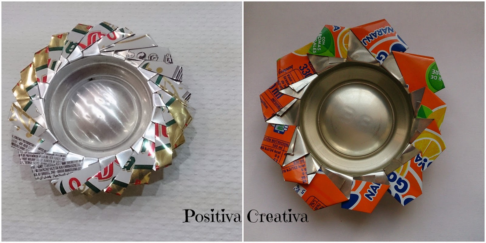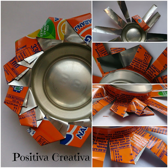 Llegados a este paso, tenemos unos ceniceros muy originales. Como podéis ver, si los cortes de la lata son más peques (como el de la derecha) se queda de otra forma.