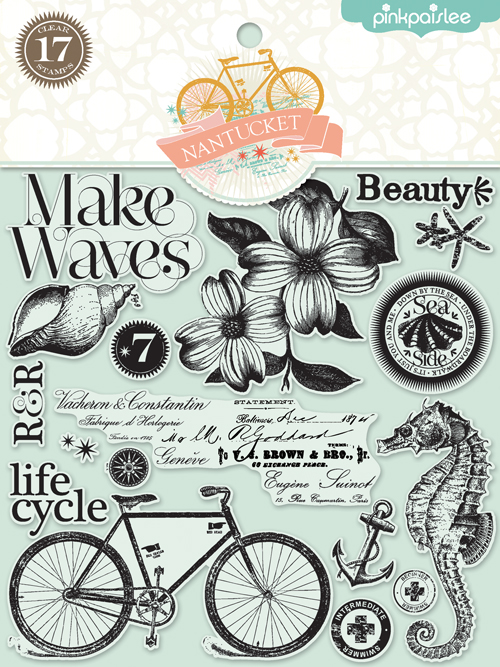 El sello Beauty debajo de la silueta de la chica, así como el sello de texto y de flores del interior de la tarjeta son sellos de la coleccion NANTUCKET de Pink Paislee.