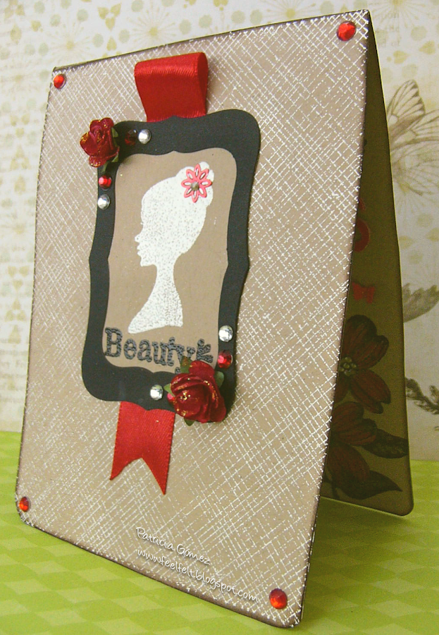 El sello central es de Hero Arts Three Silhouettes, embosado en blanco sobre cartulina Kraft.Va enmarcado en un marco negro, recortado con dos spellbinders (labels eight).