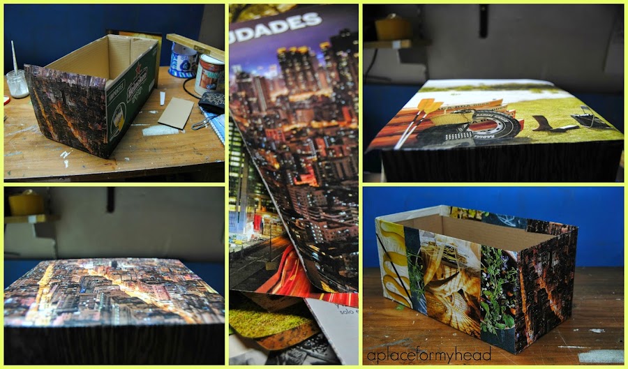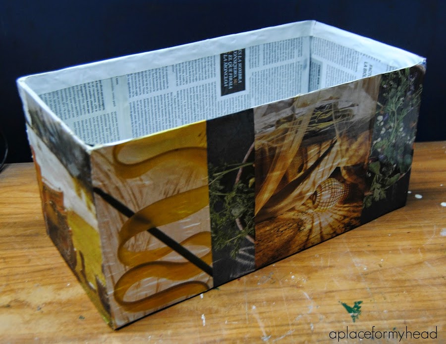 Seleccionamos las hojas con imagen para el exterior de la caja y vamos pegando con la mezcla de agua+cola creando una bonita composición.