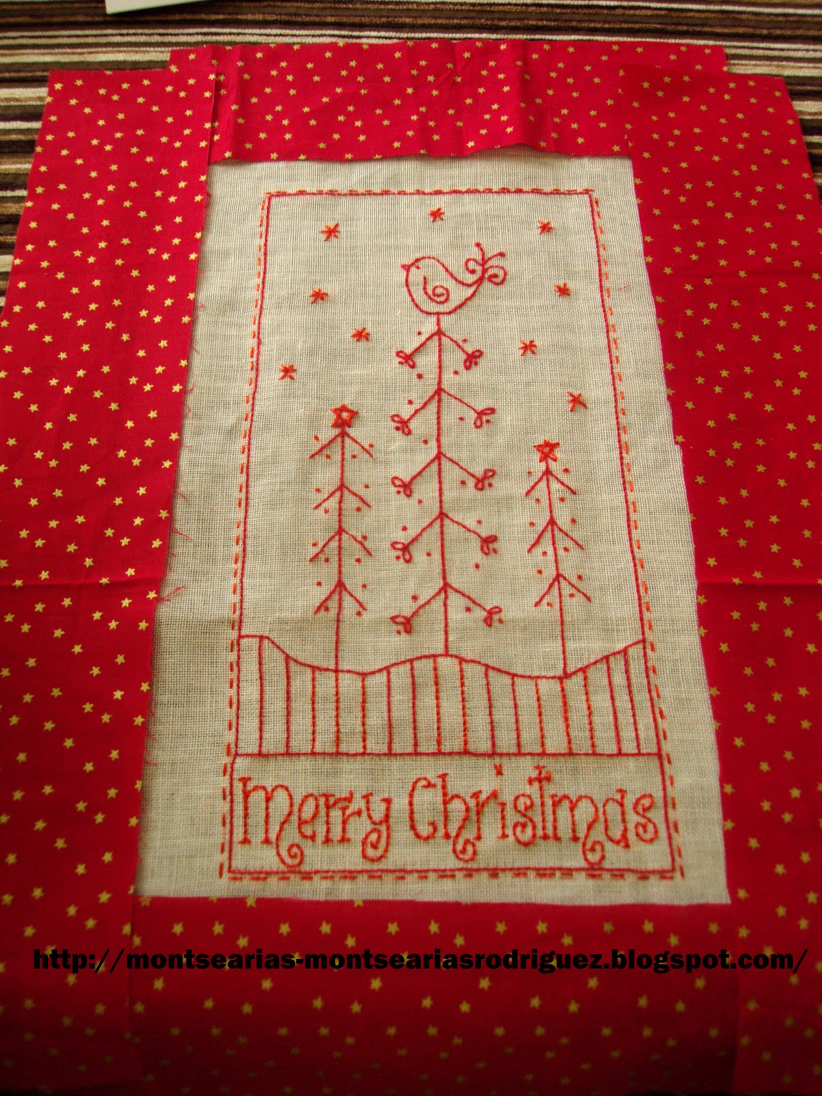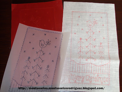 Aquí les dejo una foto de cómo empecé este redwork: sólo tenemos que calcar el dibujo (con calcar rojo), en la tela elegida y luego bordar el patrón.
