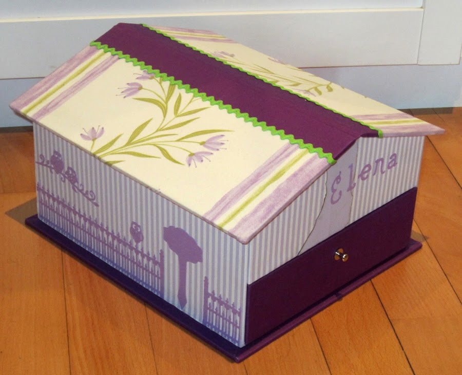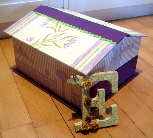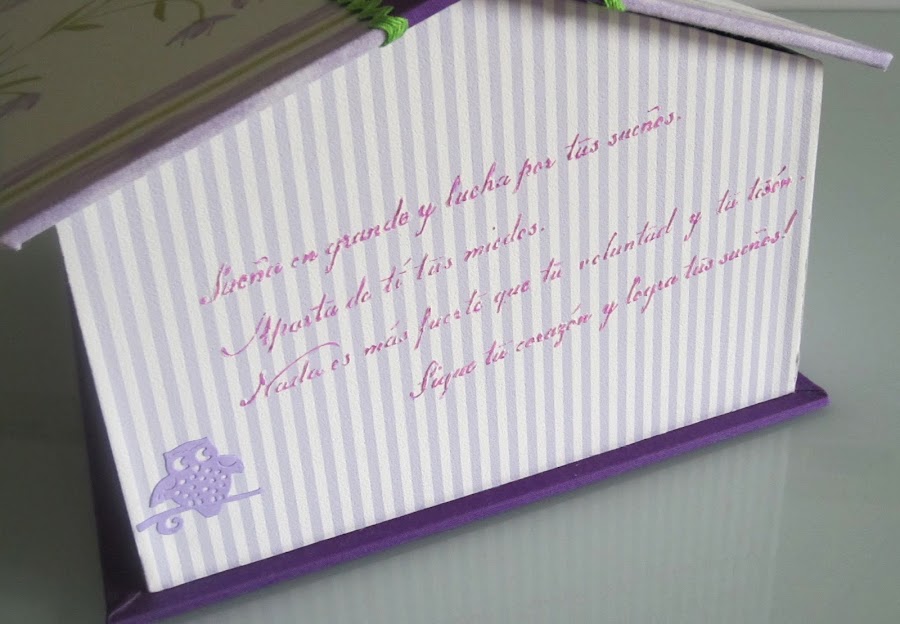 Otra de mis casitas preferidas, esta es igual que la rosa y chocolate, ¡me encanta!, esta realizada en tela y papel en tonos verdes y morados, con detalles troquelados para decorarla y un texto que hice con stencil.