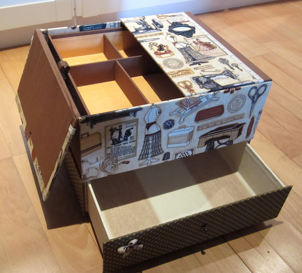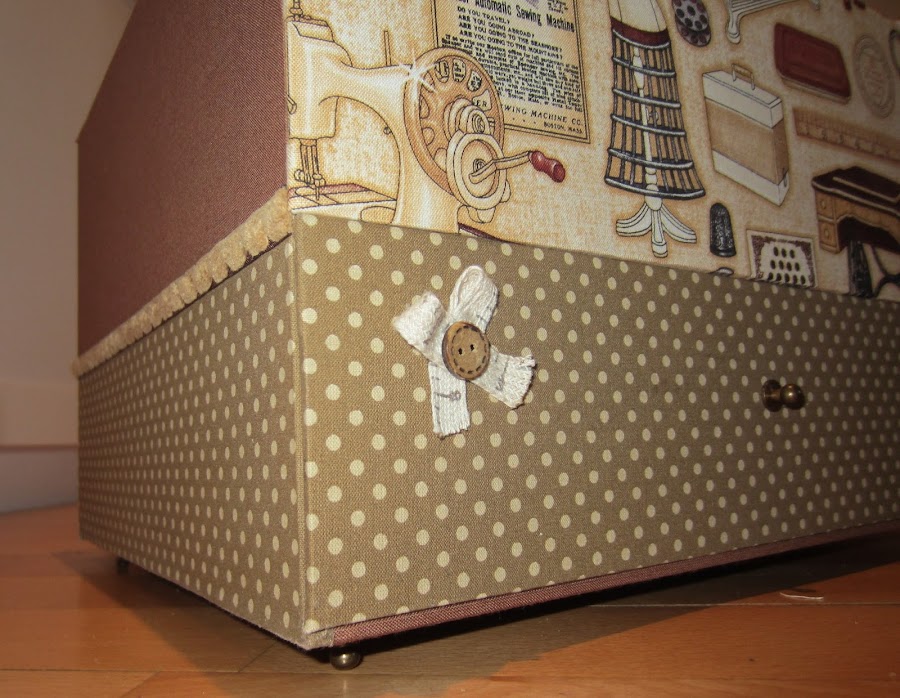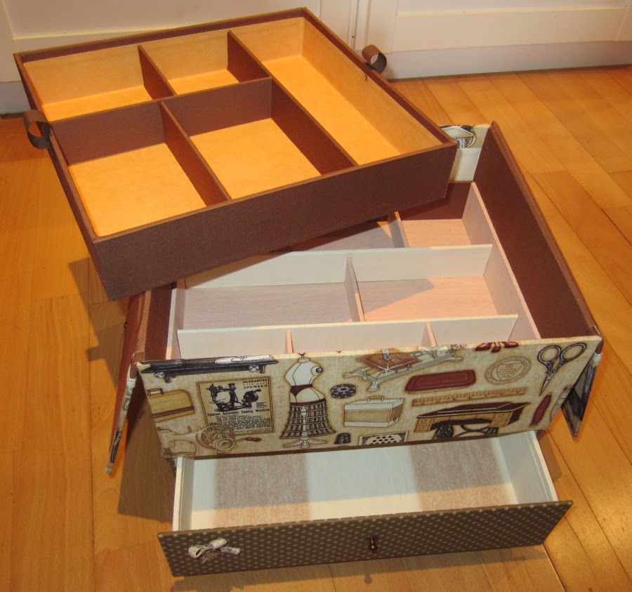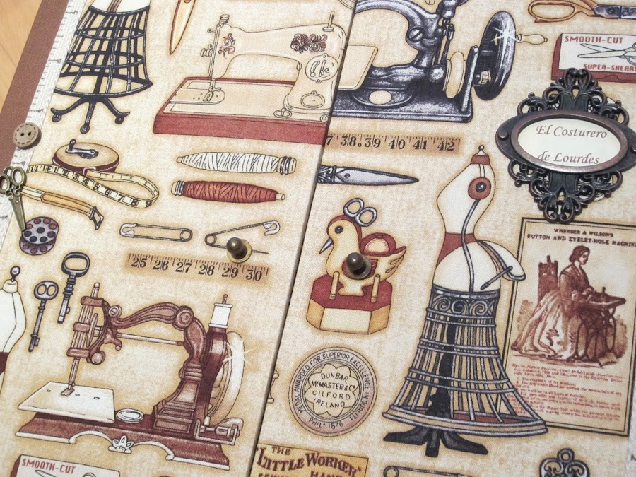 Costurero realizado con la técnica de cartonaje, con bandeja y un cajón para poder guardar todo lo que se nos ocurra, esta hecho en tela de patchwork, esta vez he utilizado tonosmarrones, tiene unas medidas aproximadas de 31x27 cm y 20 cm de altura, se puede realizar en cualquier otra medida, va personalizado con una plaquita metálica con el nombre.