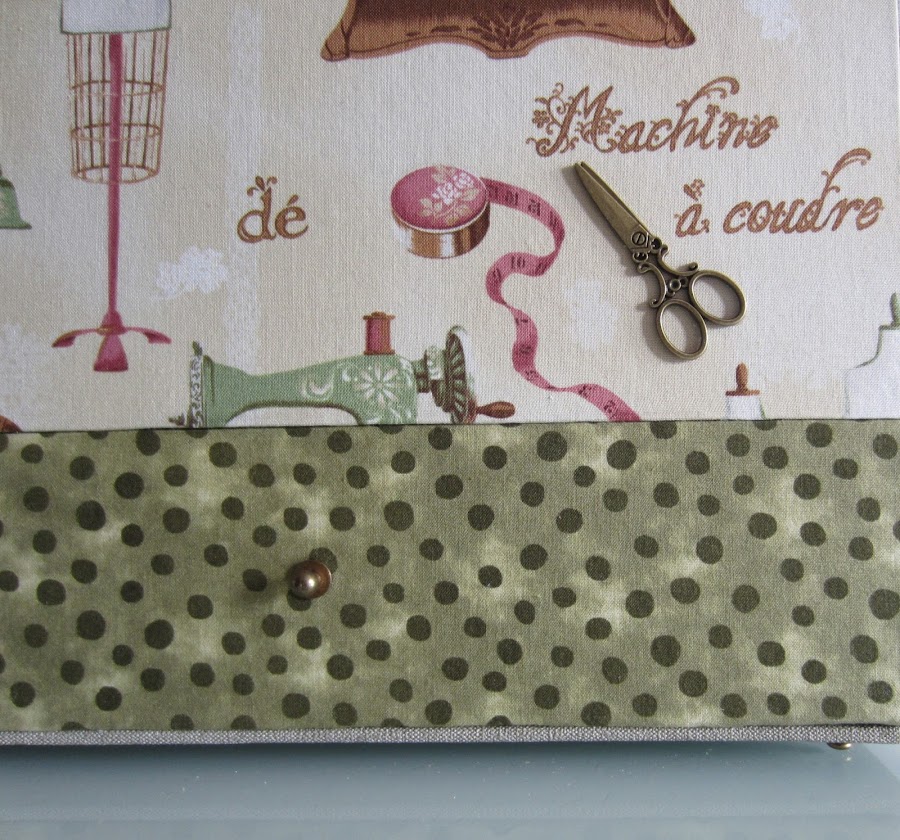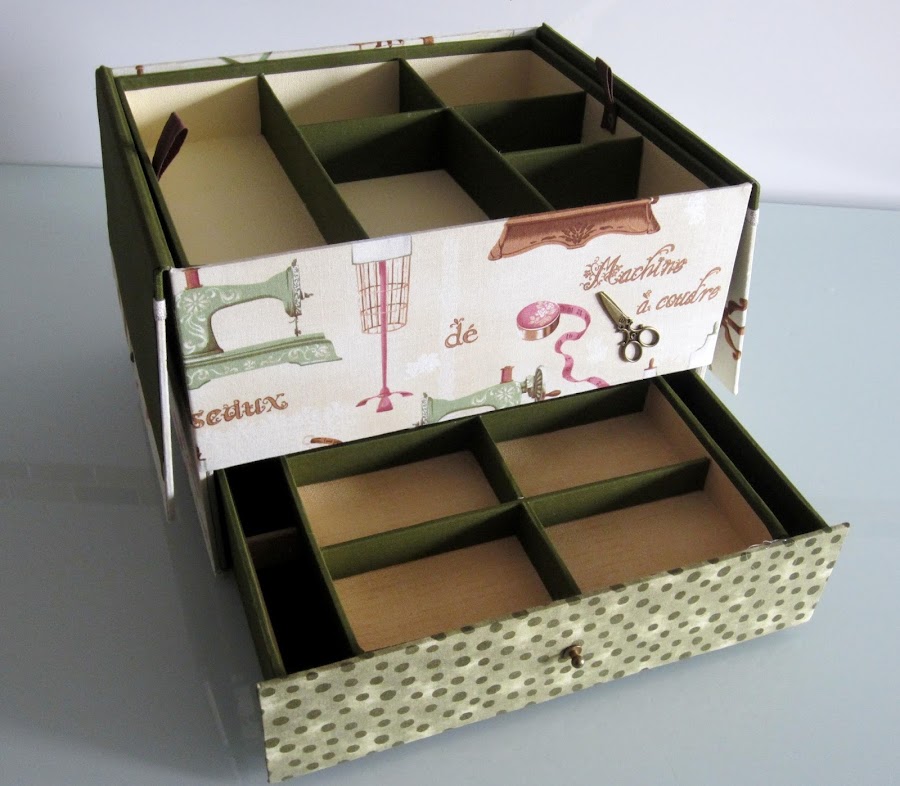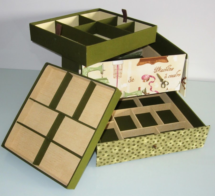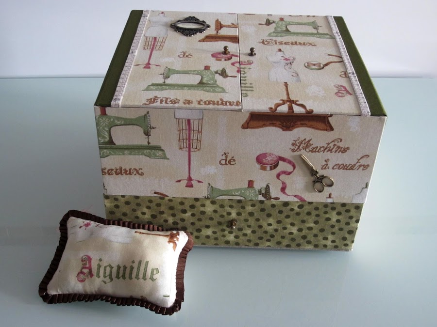 Costurero realizado con la técnica de cartonaje, con varias bandejas y cajón para poder guardar todo lo que se nos ocurra, esta hecho en tela de patchwork, he utilizado tonos verdes, tiene unas medidas aproximadas de 31x27 cm y 20 cm de altura, se puede realizar en cualquier otra medida, personalizado con placa metálica. Para completar lleva un acerico realizado en la misma tela.