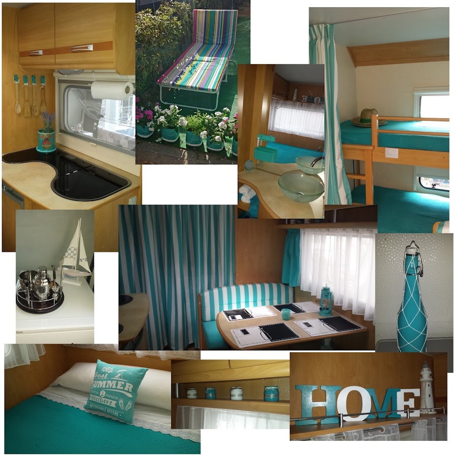 Y aquí un pupurri de fotos de diferentes detalles de la caravana, incluida la zona de descanso del avancé y la de relax del patio exterior, con botellas de agua recicladas como maceteros: