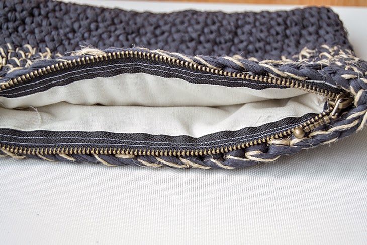 En este caso es un poco diferente ya que el trapillo no se cose tan bien con la máquina de coser, así que debemos hacer un bolsito de tela ligera con cremallera, de las medidas de nuestro bolso (pero que queden las costuras del revés) y luego meterlo dentro de nuestro bolso de trapillo y coser a mano la cremallera al borde de trapillo del bolso. Tenéis un tutorial donde se explica en DIY by Paula