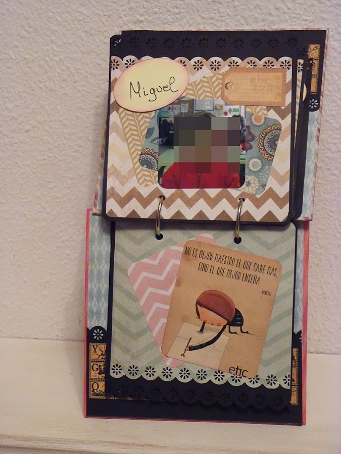 En primer lugar, un álbum para una profesora, recuerdo de todo un curso. he utilizado estos papeles de Graphic45 que le dan un cierto aire vintage. En el interior, tarjetas con frases alusivas al maestro y una hoja por alumno, personalizada con su foto, nombre y algún tag escolar.