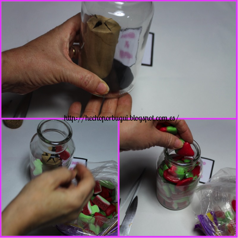 Para a continuación rellenar, el espacio que queda al rededor del tubo, de golosinas.