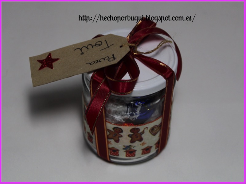 Lo he decorado con un trozo de servilleta con motivos navideños y un lazo.