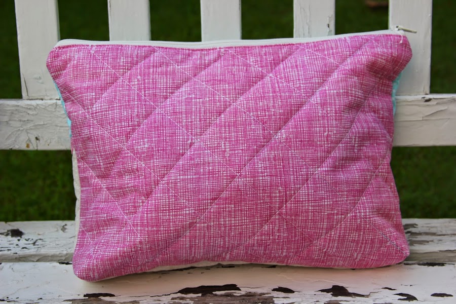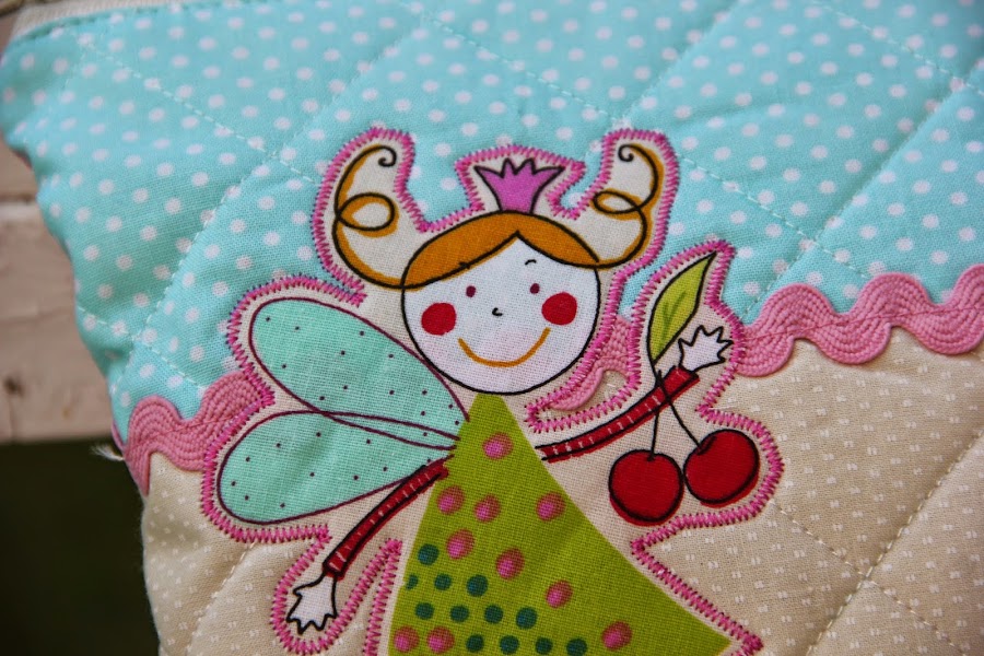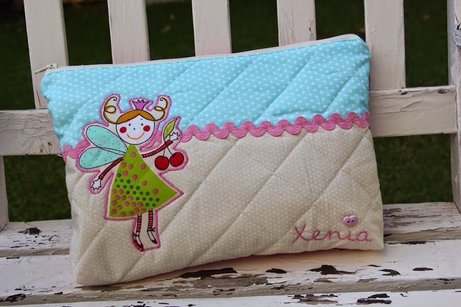 El neceser lleva aplicada una de las muñecas de la tela de las bolsitas de merienda. Está aplicada a máquina con zigzag