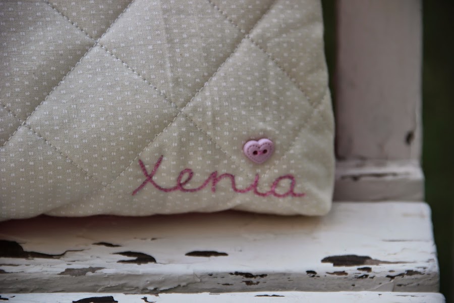 Para personalizar aún más el neceser bordé el nombre de la niña. En principio quería poner botones de letras como ya he hecho en alguna ocasión (podéis verlo aquí) pero como no los encontré del color que quería decidí bordarlo y colocarle un botoncito de corazón. La verdad que me ha encantado el resultado. Queda más discreto y muy fino.