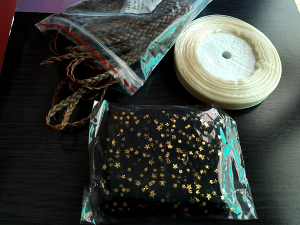 Y sí, aún más cosas... Una cinta de organza amarillo pálido, un montón (no sé ni los metros que vendrán) de trenza de cuero marrón y tul negro con estrellitas. Precioso todo. Ya tengo a las musas pensando a ver qué hago...