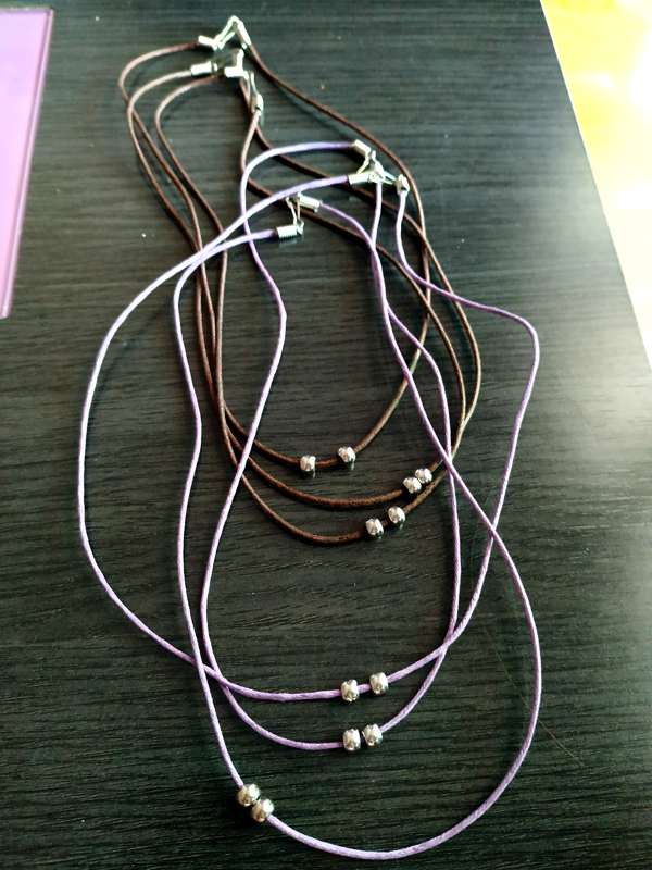 Siguiendo con los colgantes, como Mía sabe que hago mucha bisutería, también me ha mandado unos cordones en marrón y otros en morado, también con sus cierres y su bolitas listos para ponerles el colgante oportuno y lucirlo.