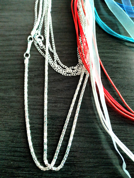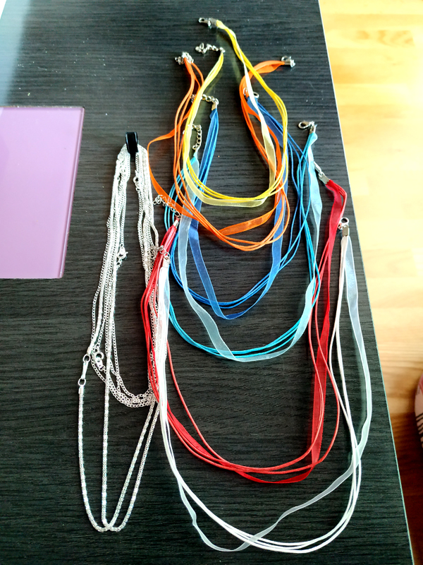 Sigo con estas cadenas y colgantes para collares. Son unas cadenas preciosas (a continuación os pongo un detalle para que lo veais mejor) y otras normales de color plateado. Super útiles. Y 6 collares más de diferentes colores compuestos por cinta de organza y cordón del mismo color. Listos ya para ponerles un detalle colgando y lucirlos.