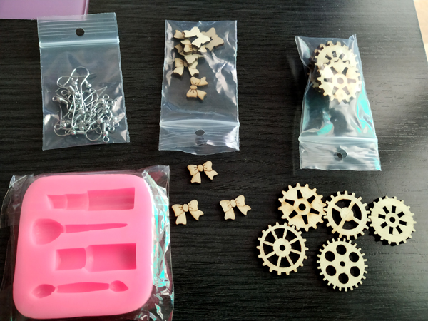 También enganches para pendientes, que me van a venir genial para hacer los conjuntos con los collares anteriores, y chipboards de madera de unos lacitos monísimos y de engranajes, que se ve que Mía también se ha anotado que me encanta el SteamPunk. También un molde de silicona de cosas de maquillaje al que seguro también le doy buen uso.