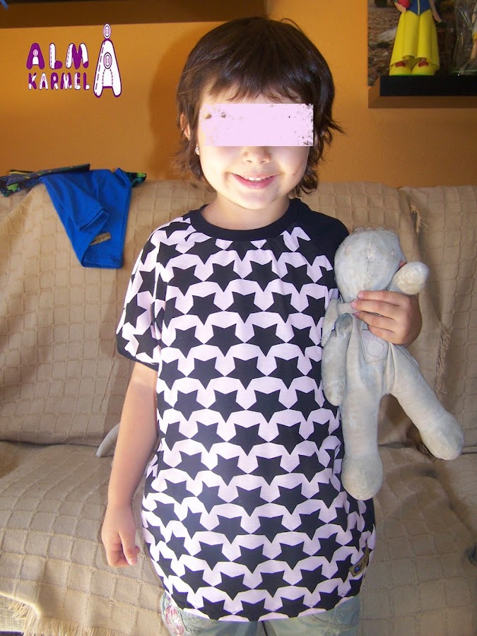 Camiseta rosa y negra de estrellas, el rosa para mi niña es imprescindible.... y como podéis ver estaba muy contenta. Dijo que se la quería llevar el próximo día a clase de baile, porque era muy chula y nadie la tenía igual.