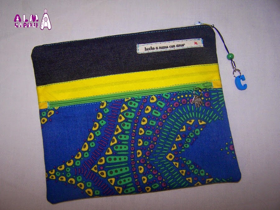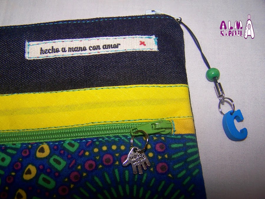 La cartera me encanta con su colorido amarillo en contraste con los azules ;) y todos los detalles que tiene, cuidado todo "con mucho amor" como dice la cinta que va cosida, la manita de "hecho a mano" y la inicial de mi nombre,Carmen. Pero eso no es todo, por dentro va forrada, y en la tela que es azul, un sello con el anagrama de Rojo Ababol, que se ve poquito y la cámara no lo saca, pero ahí está.
