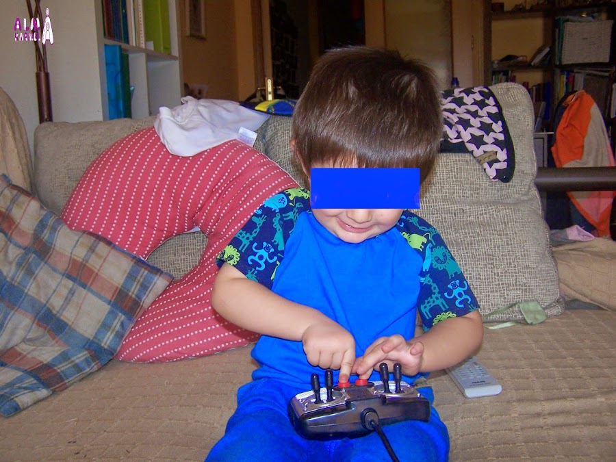 Y aquí el peque, jugando todo feliz, se pasó toda la tarde señalando y nombrando los animales de la camiseta, él se pidió ser el mono, y además en su color favorito... el azul.