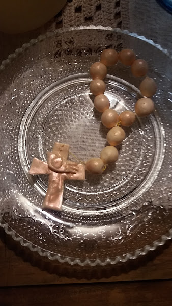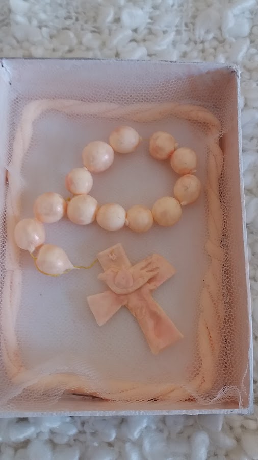 Dentro de la cajita, al abrirla te encuentras con un bonito rosario para poner en la muñeca a modo de pulserita.