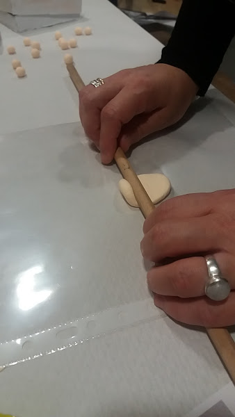 Al fondo de la imagen veis las bolitas del Rosario secándose. Mientras tanto con un palo de madera redondo, no tenía otra cosa, fui aplanando la masa. Como veía que se pegaba, la puse sobre una lámina de plástico. Es la primera vez que trabajo con este material, y todo son descubrimientos!!!