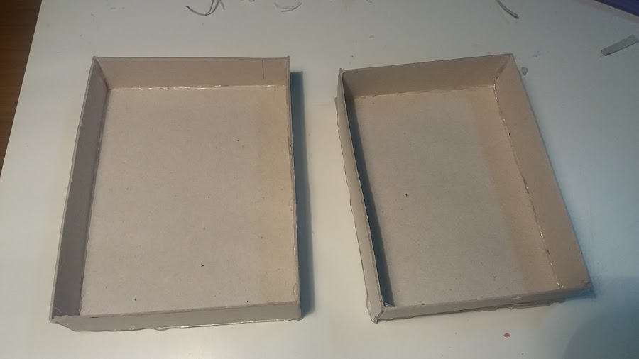 Aquí os muestro todas las piezas de una de las tapaderas que forman la caja. Y abajo las veis ya pegadas con silicona caliente. Como siempre sobresale algo de pegamento , pero con unas tijeras lo recortas.