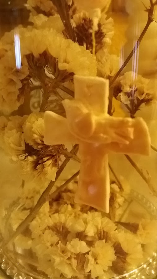 Con el estilete, hice la cruz y la paloma símbolo del Espíritu Santo . Y con la paletina iba retocando.