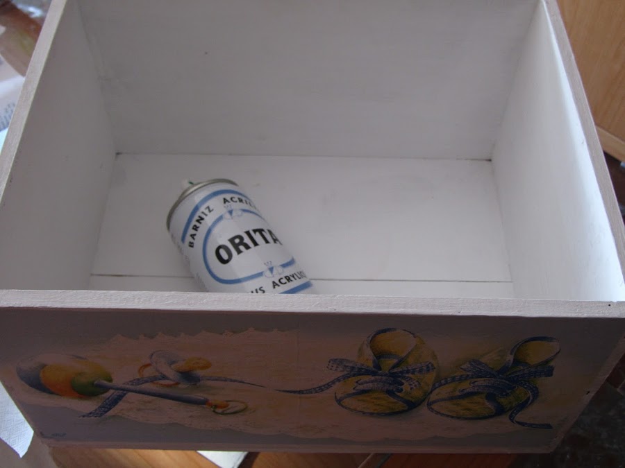 Si la caja está hecha con decoupage podéis eliminar las servilletas y restos de cola humedeciendo las servilletas con agua y posteriormente frotando con un estropajo. También podemos ayudarnos de un cúter para los restos más difíciles.