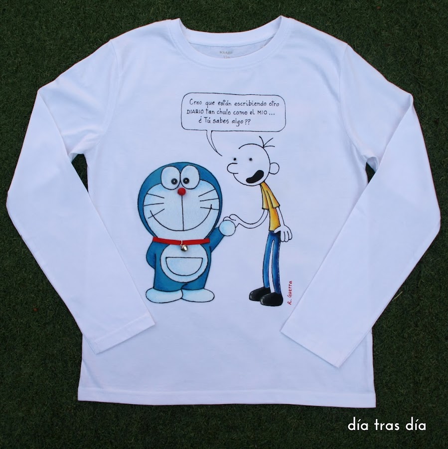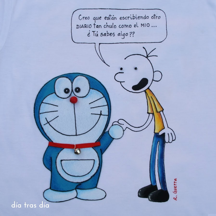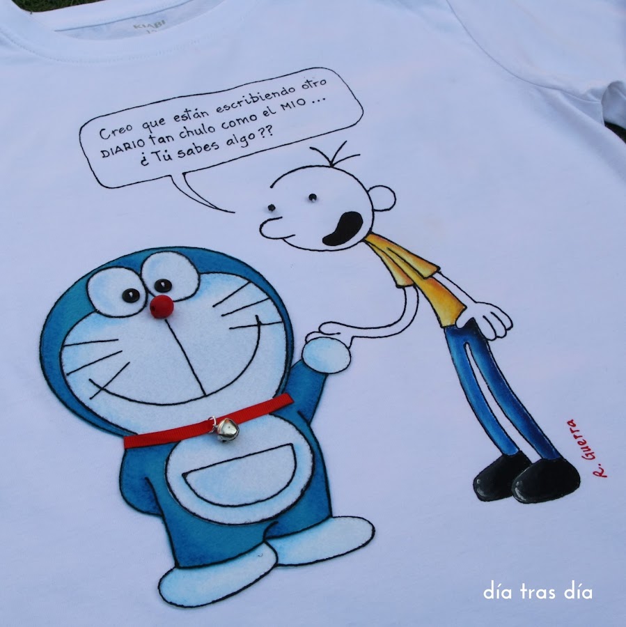 Iván me dijo que a Tomás le gusta mucho la serie de dibujos animados Doraemon, así que la primera opción que se me ocurrió fue hacerle una camiseta con este personaje, que ya he hecho en alguna ocasión tanto sobre camiseta como en mochilas. Aquí o aquí podéis recordarlo.