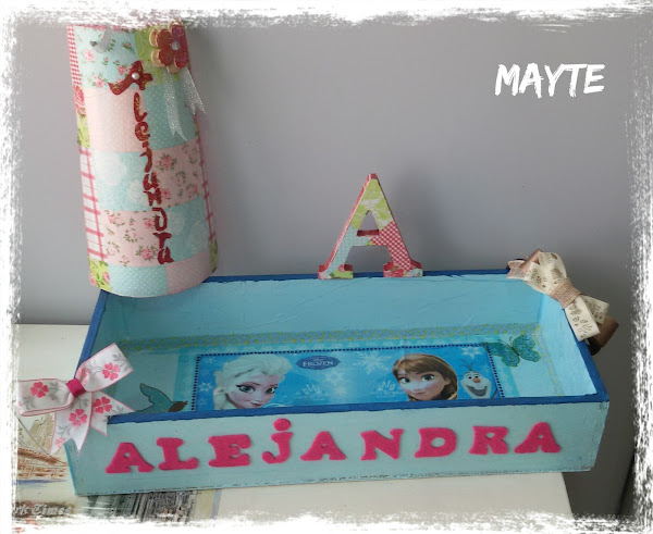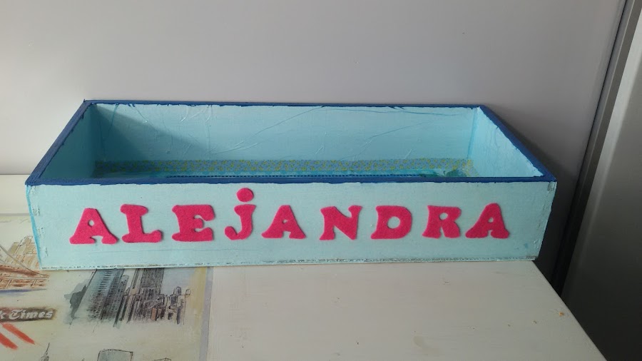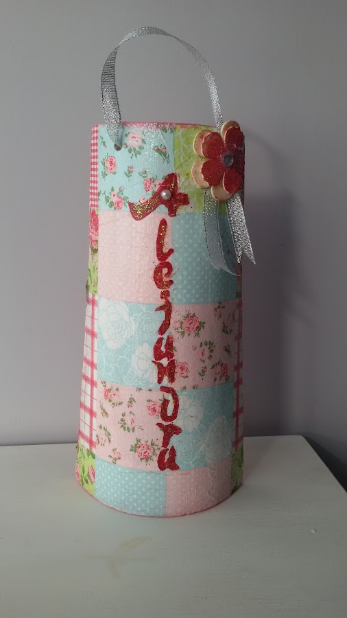 y despues añadi un estencil con el nombre,una flor y tira plateada para colgarla