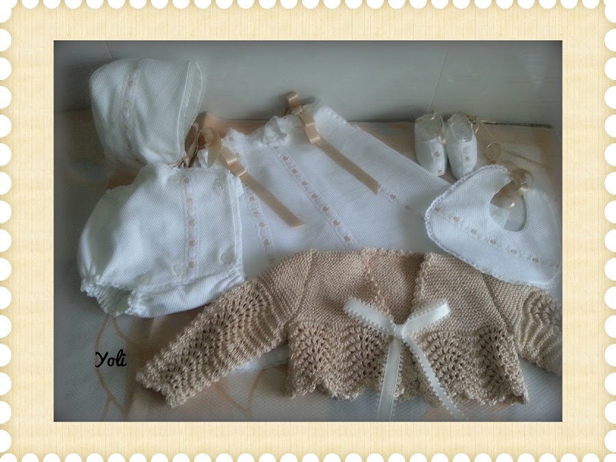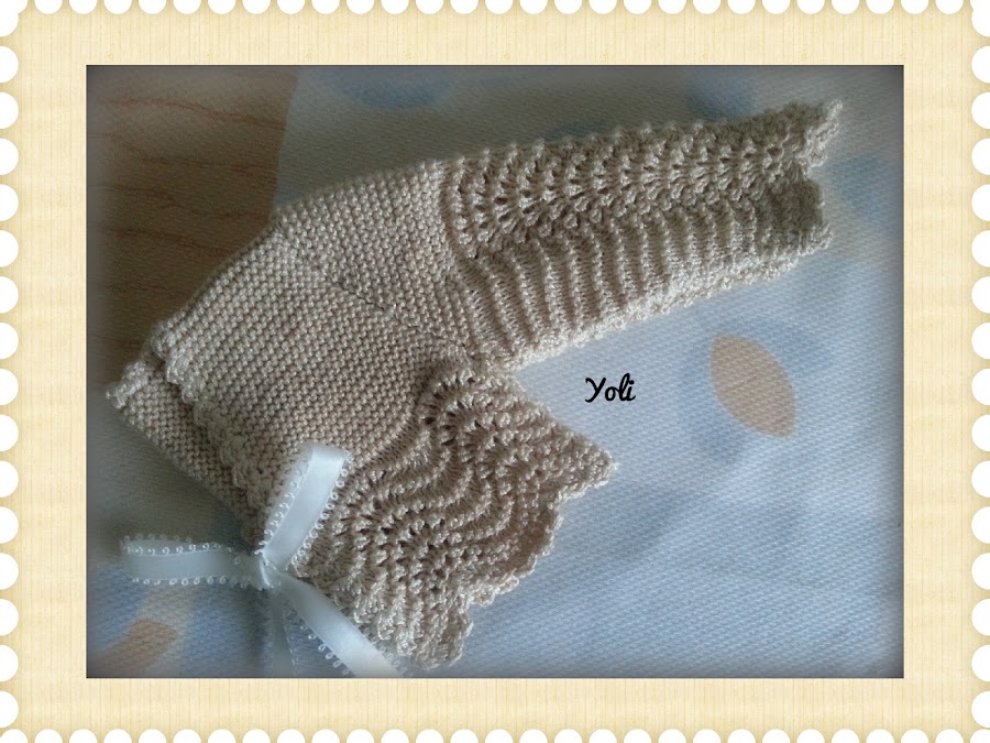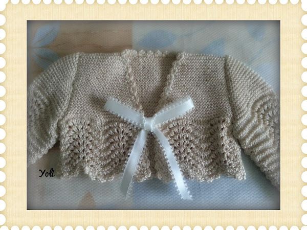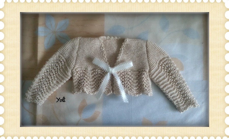 Todo el conjunto es una talla 3 meses perfecto para el otoño que aquí en el norte no suele ser muy frío. La chaqueta esta tejida en perle egipcio doble para que cogiese un poquito mas de cuerpo y así abrigase un poquito mas.