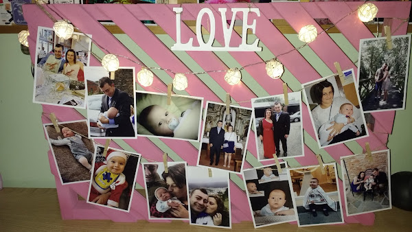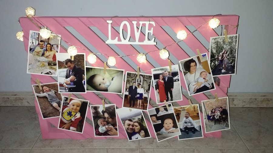 Encontré este panel de madera y enseguida supe que me serviría para algo. Lo que no tenía claro era para qué. Tiempo después pensé que un detalle lleno de fotos y luces sería el regalo perfecto para los novios y su peque.