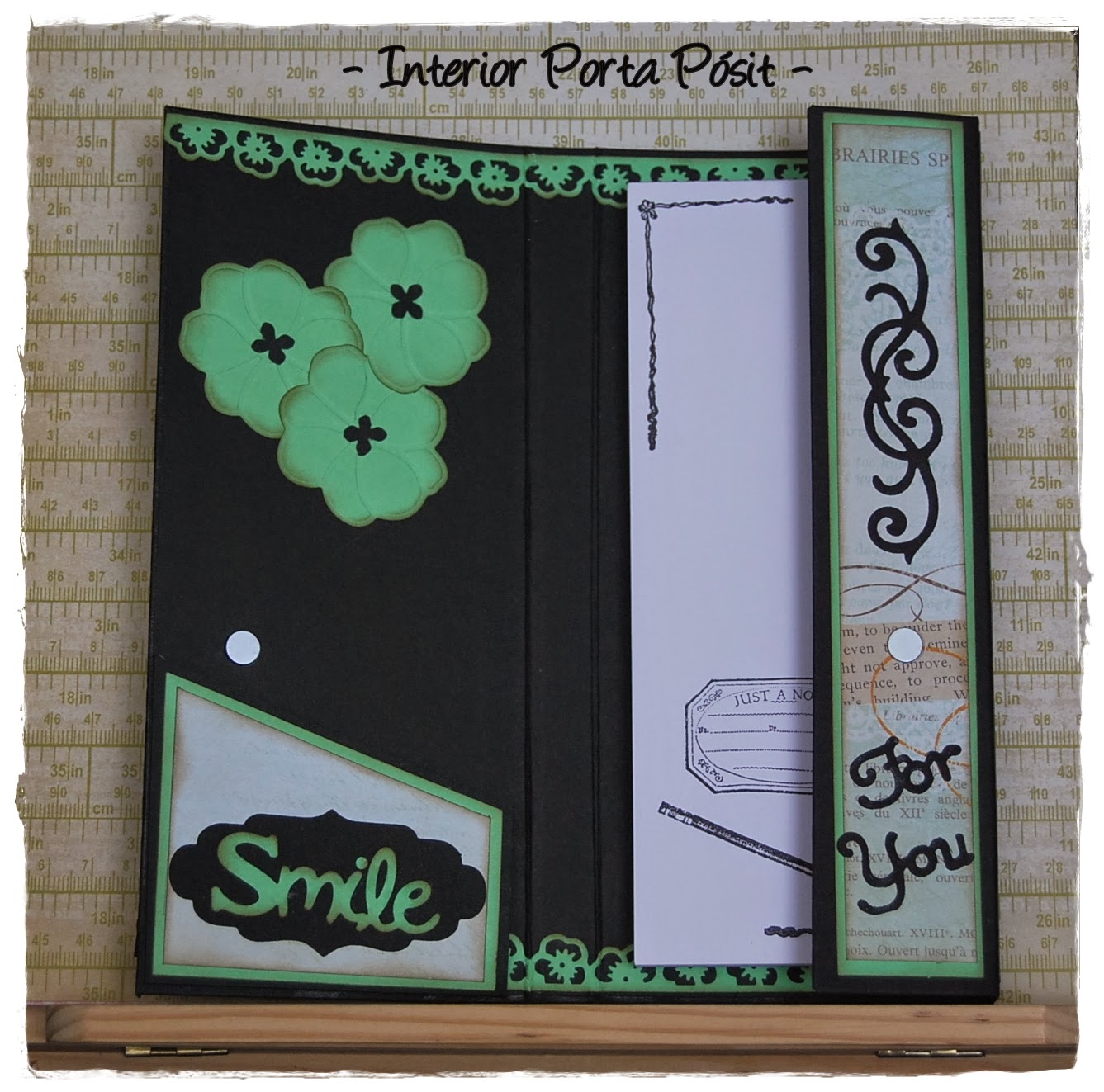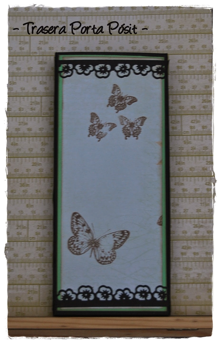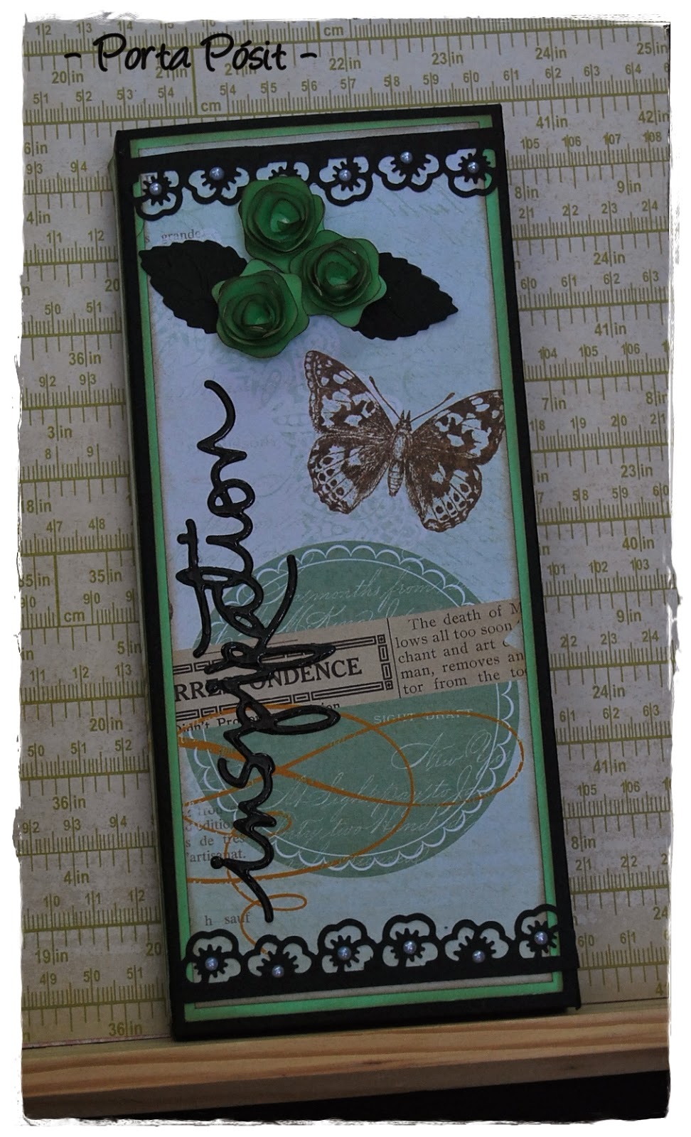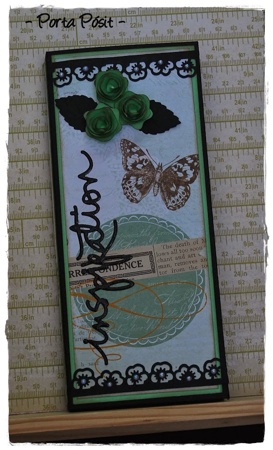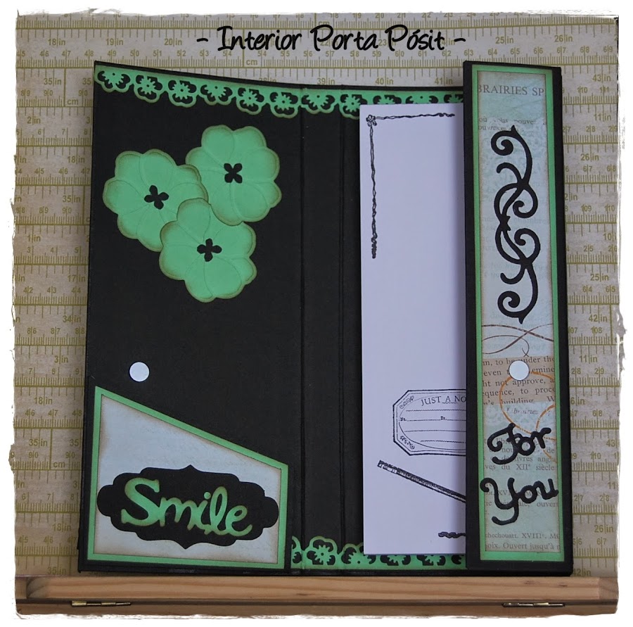 Un nuevo porta-pósit para felicitar y alegrar el día de su cumpleaños a Tina... realizada con papel de My Min´d Eyes combinado con cartulinas negra y verde y una tarjeta a juego. ¡Felicidades, Tina!!!!