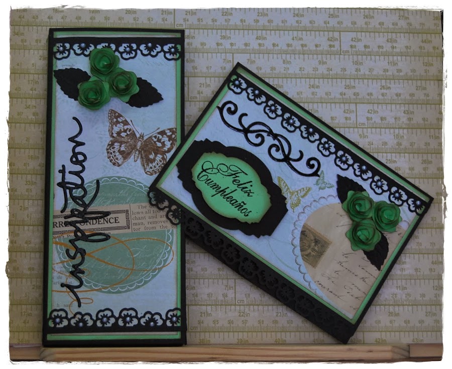 Nueva entrada para presentar el regalo que preparé para Ruth en su cumpleaños, aunque le llegó un pelín tarde (Sorry!... ) Un conjunto scrapero trabajado en cartulina negra como base, combinada con papel Scrap (no recuerdo la colección...) en tonos verdes, uno de sus colores favoritos, y cartulinas rosa y verde a contraste... Unos troquelados, unos sellos embosados, unas perlitas, unos lazos. ...