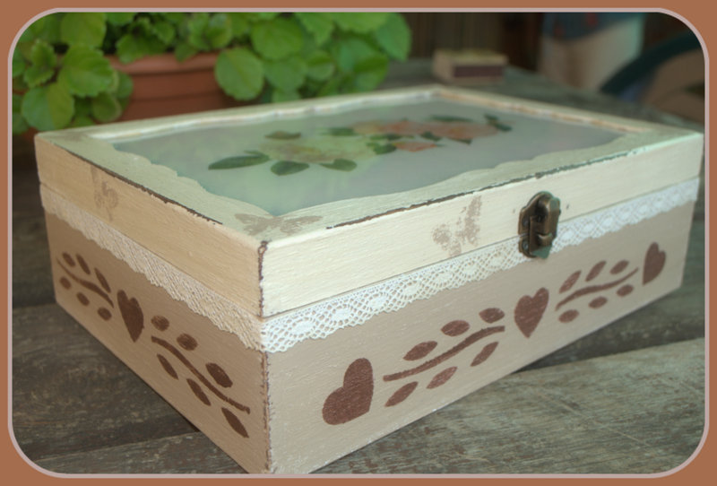 El cristal está decorado con decoupage y esponjado en marfil como la parte superior de la caja y rosa muy flojito,le puse una puntilla que me encanta como le queda.