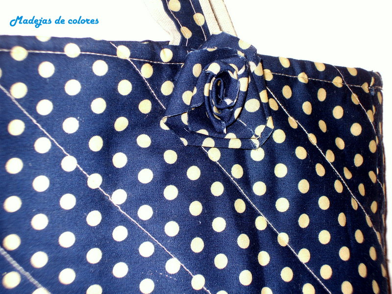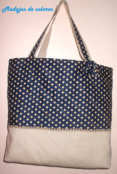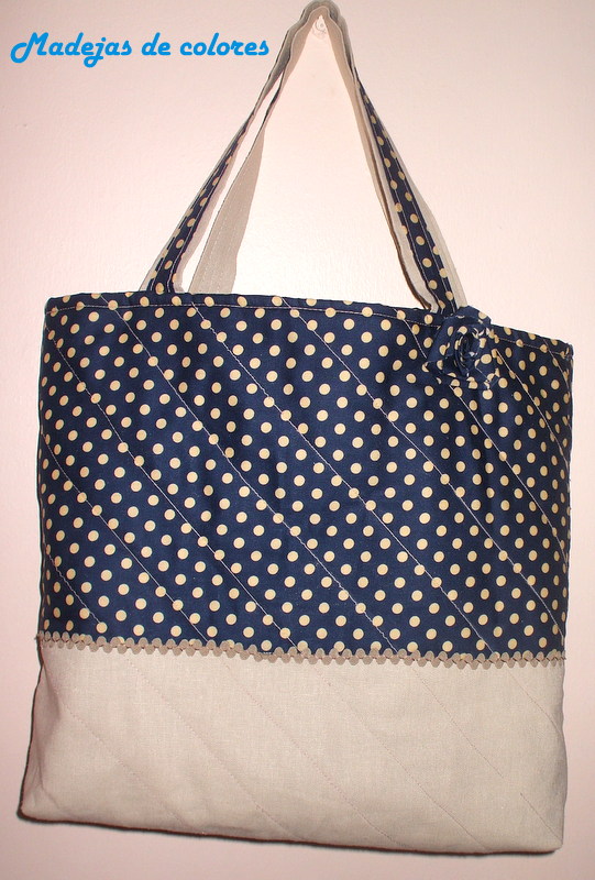 Combinando un lino tostado con otra de algodón azul marino con topitos beig, realicé el bolso. En el asa también las combiné. Y acolché a máquina, poniendo un piquillo en la unión de las 2 telas.