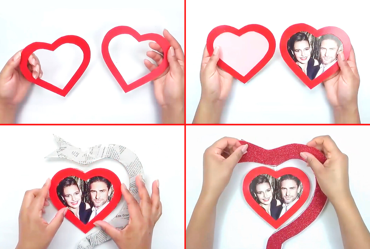 Pegar en los corazones una foto y un papel para escribir una frase en él.