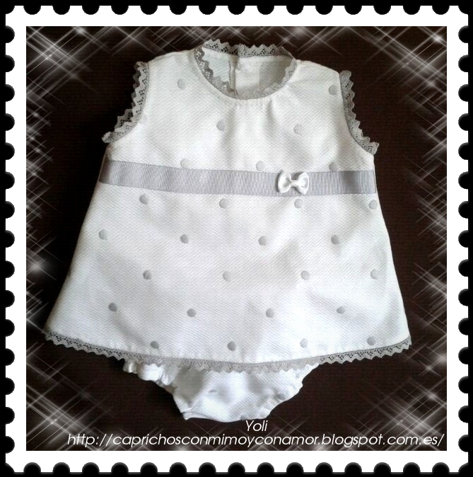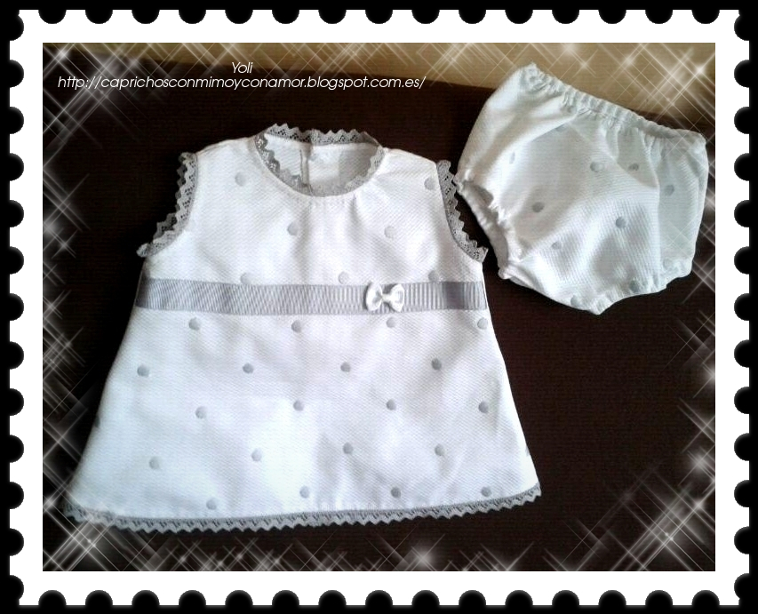 Primero os enseño el jesusito de pique blanco con bodoques grises bordados, en principio solo iba a ser el vestidito pero sobraba un retalito y se completo con la braga a juego.