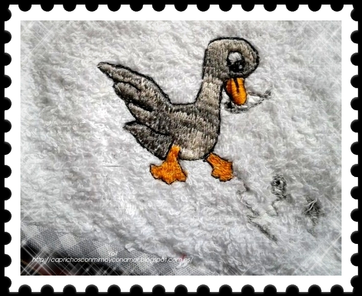 También ama la bordo y la hizo su ya muñeca toallero jaja personalizada con su nombre, y un babero blanco de rizo ribeteado con vichy gris y un simpático patito bordado