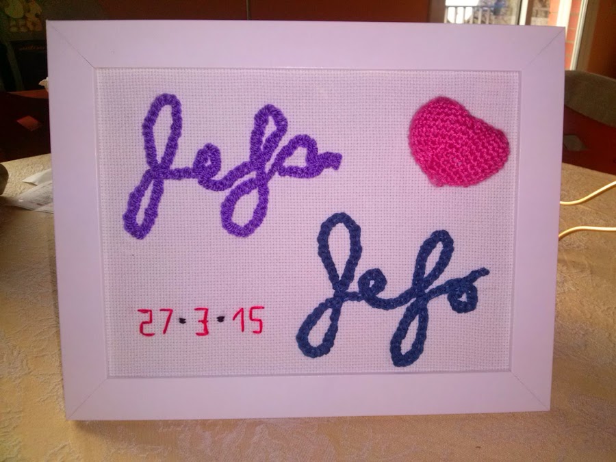 Cuadro hecho de cadeneta (nombres) y corazon hecho en relieve (amigurumi)