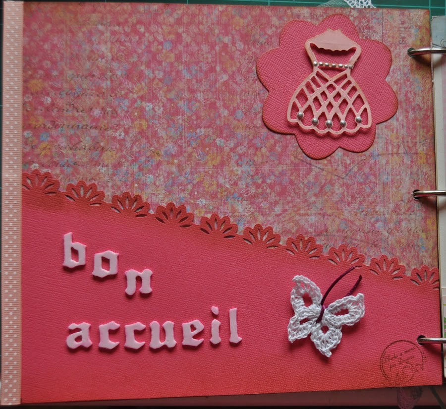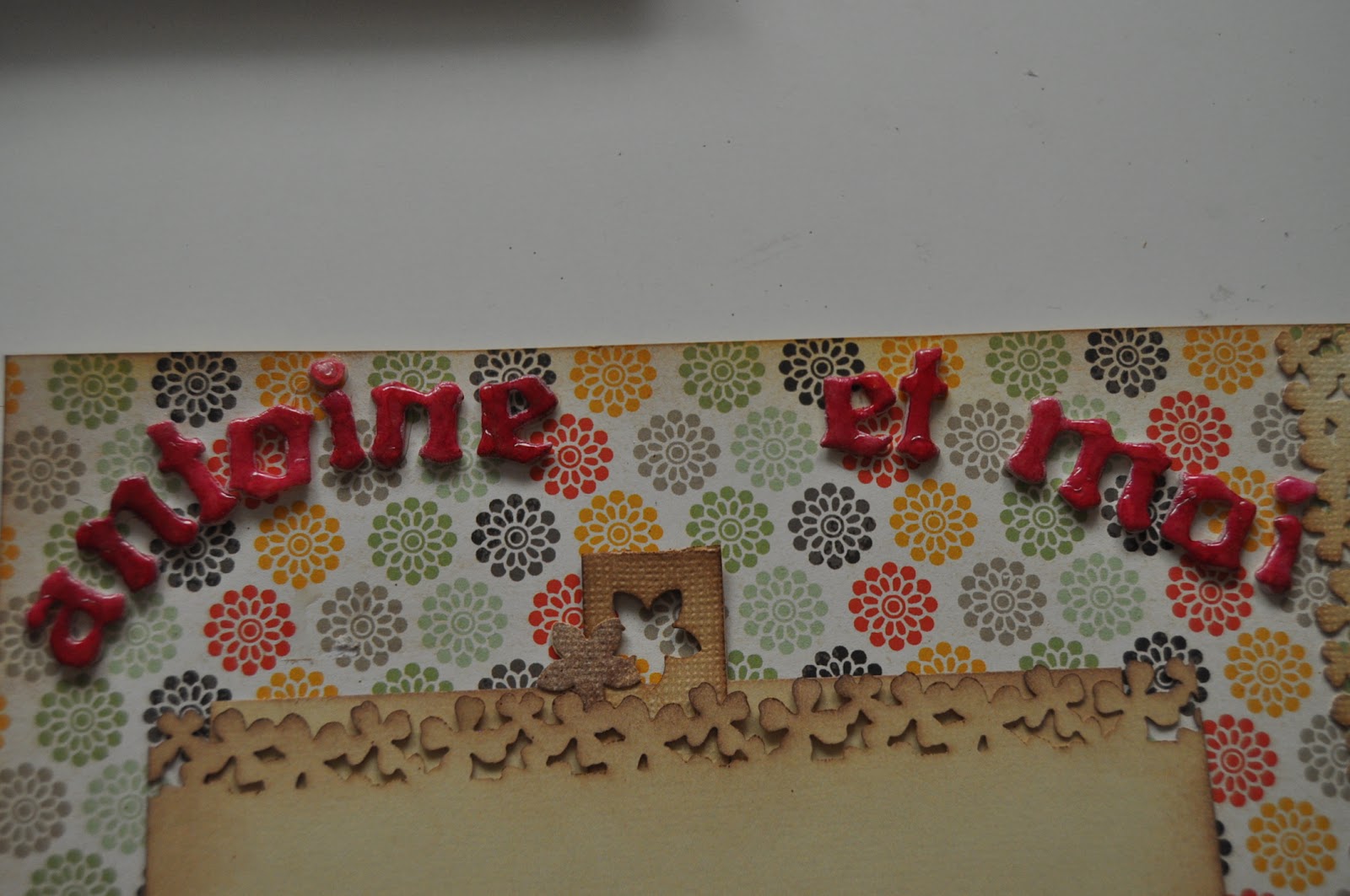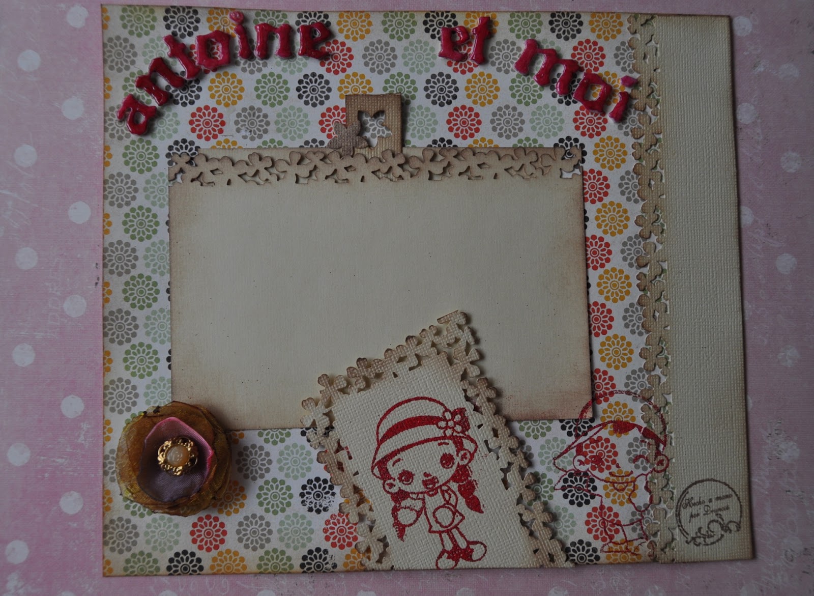 Yo preparé la página dedicada a la niña con su hermano, Antoine, y también me encargué de la encuadernación del álbum con la inestimable ayuda de Goyi, Walkiria, Mari y Luisa Fernanda que me ofrecieron ideas y material para llevarlo a cabo. Era mi primera encuadernación de un álbum de scrap.