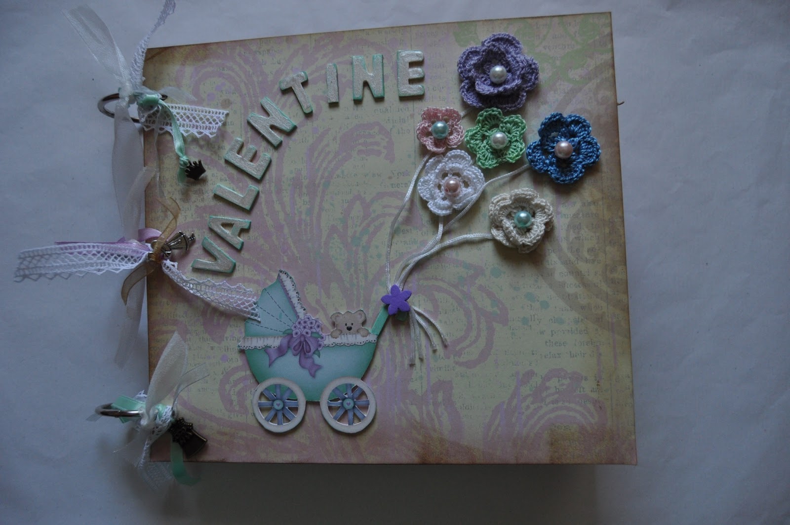 Los papeles son del taco-papeles de María. La portada la decoré con un carrito de bebé impreso en cartulina y pegado con cinta 3D. Al asa que puse le até unos hilos que "sujetan" unos globos-flores que me regalaron Roxana y Marga. Luego les puse una perla grande de distintos colores.