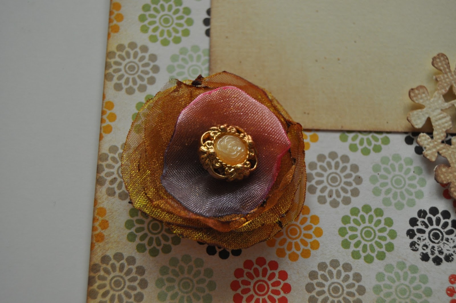 Ésta fue la página que yo realicé. No recuerdo la marca de la página. Las cartulinas del bolsillo y las tarjetas son texturizadas. Los muñequitos, el niño y la niña, están embosados. La flor está hecha con cinta de organza de diversos tonos, a la que quemé los bordes, rematada con un botón regalo de Luisa Fernanda.