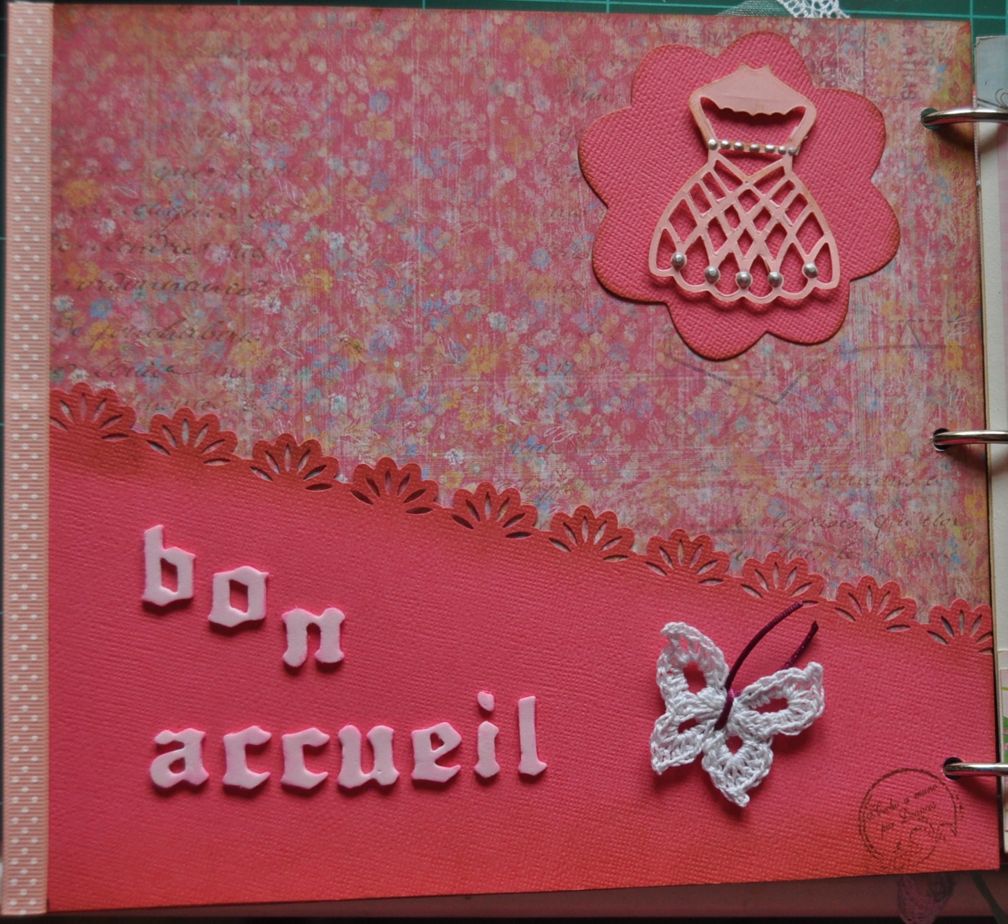 Las palabras "Bon accueil" (Bienvenida) están troqueladas con goma eva rosa palo.