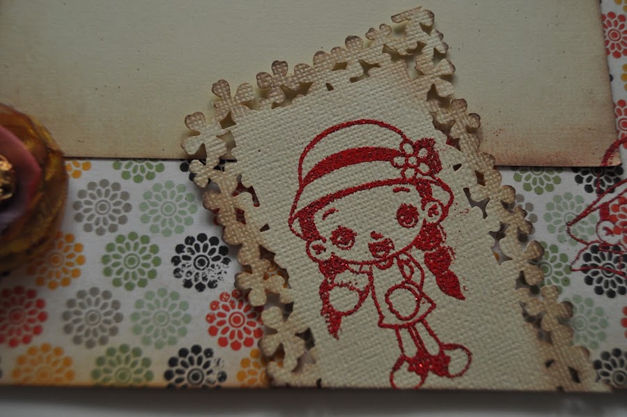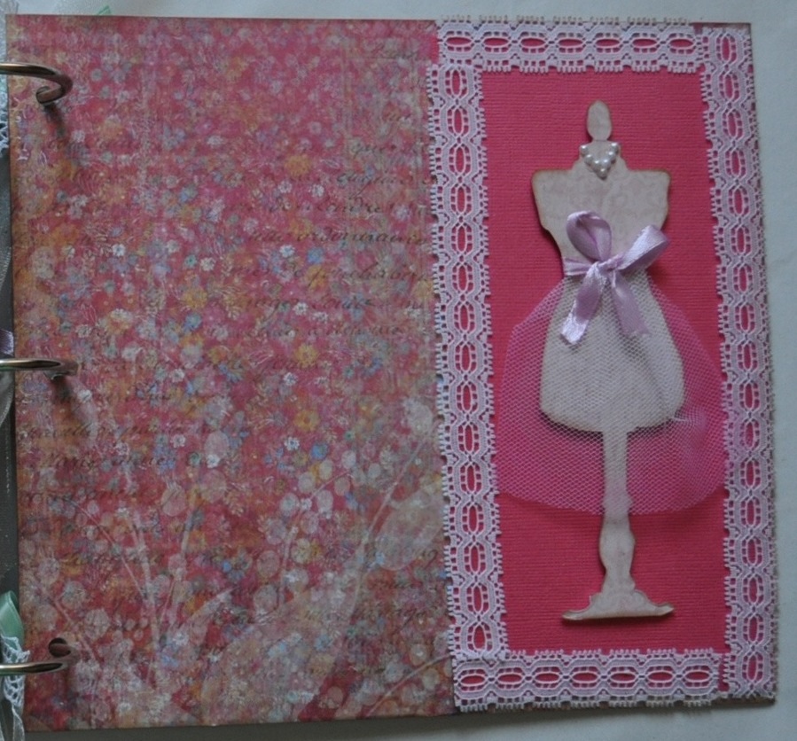 La contraportada tiene un bolsillo con una flor también regalada (yo no sé hacer esas preciosidades en ganchillo). Sobre el troquel de la parte superior pequé un vestidito que me envió Mari para decorar las tapas, y que pegué con cinta 3D para darle relieve. Luego le puse unos toques de perfect pearl plateado.