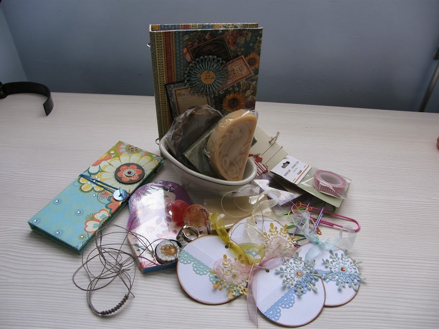 Y aquí el conjunto de regalos, un poco de todo, jabones, libreta, bisutería, unos adornitos navideños hechos con papel y uno especial: un recetario de amigas, pedí a las chicas del grupo que me enviaran una receta con una historia, las recopile y lo encuaderne a modo de recetario, se que le gusto todo mucho mucho.....