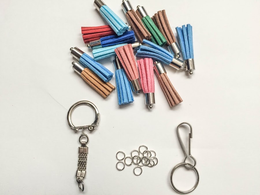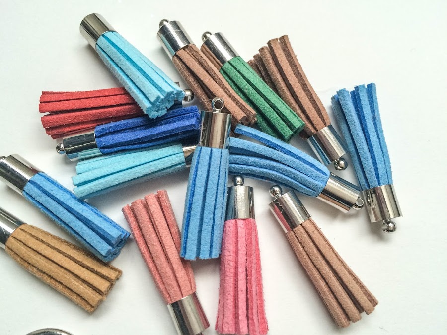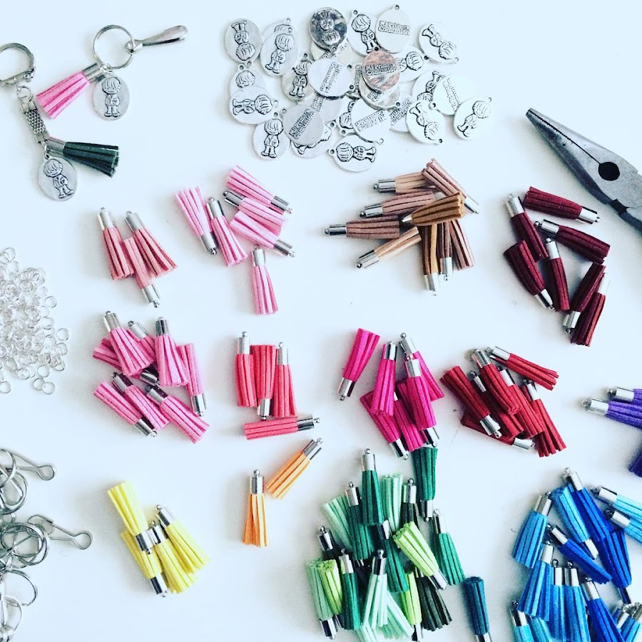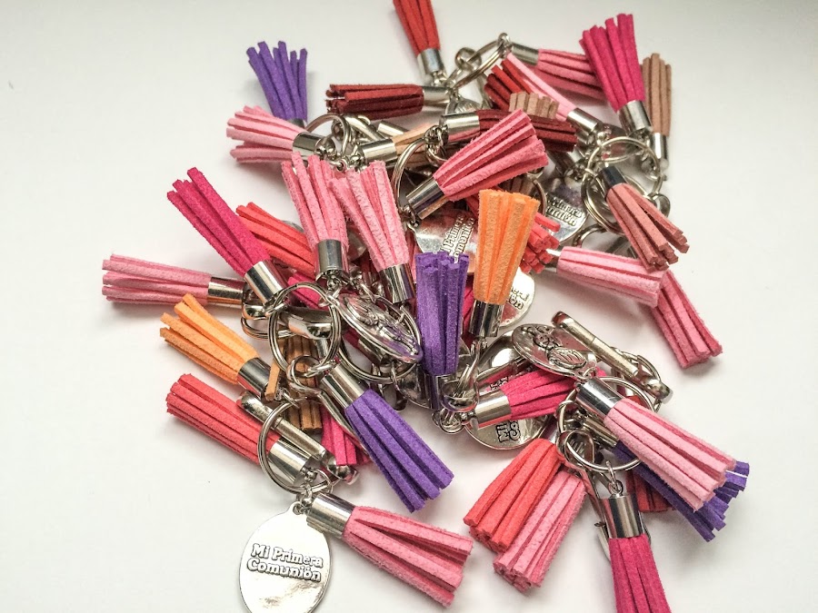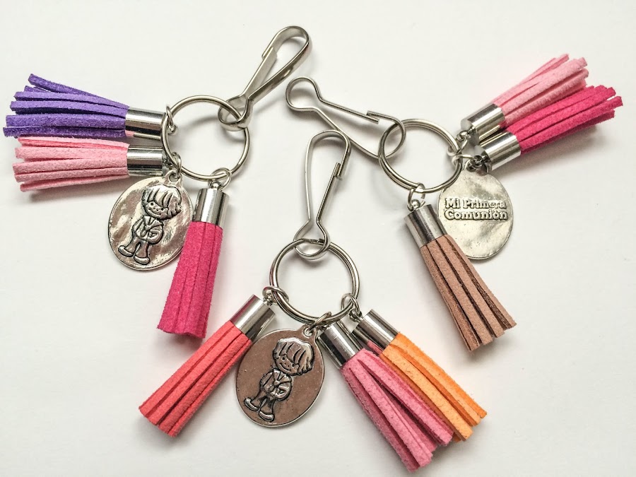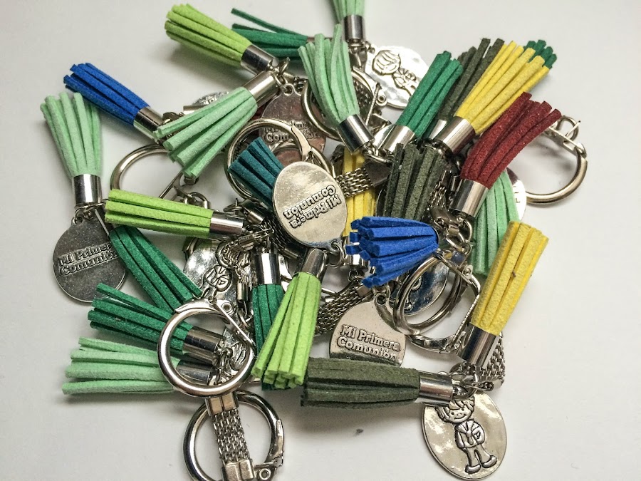 Además, borlas de cuero de múltiples colores y arandelas para enganchar tanto las borlas como las medallitas.