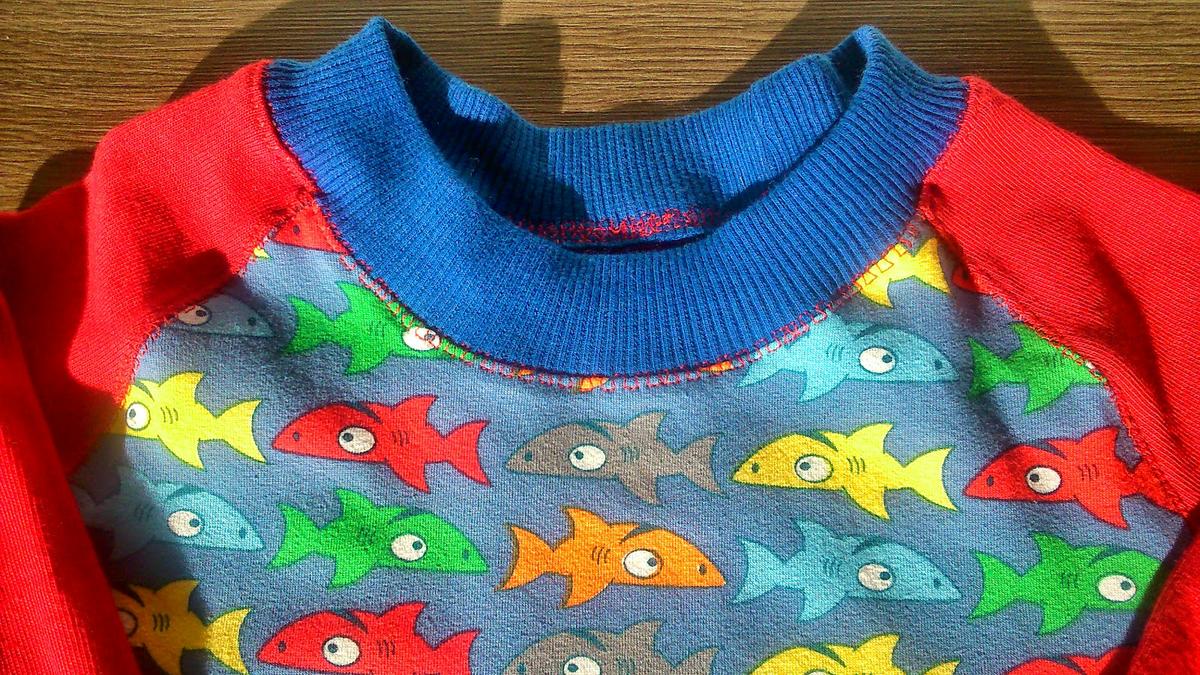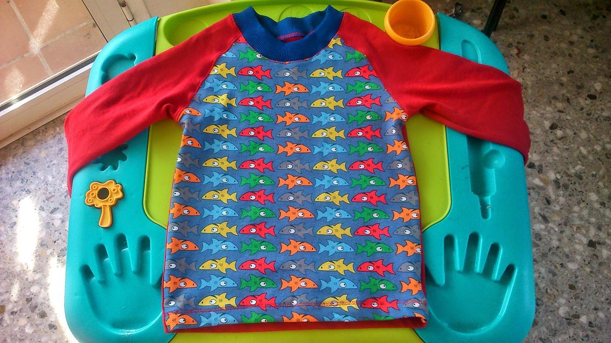 La tela de tiburones me encanta, son coloridos y muy monos... ya le había cosido una camiseta a mi niño, la podéis ver AQUI