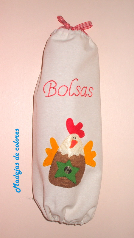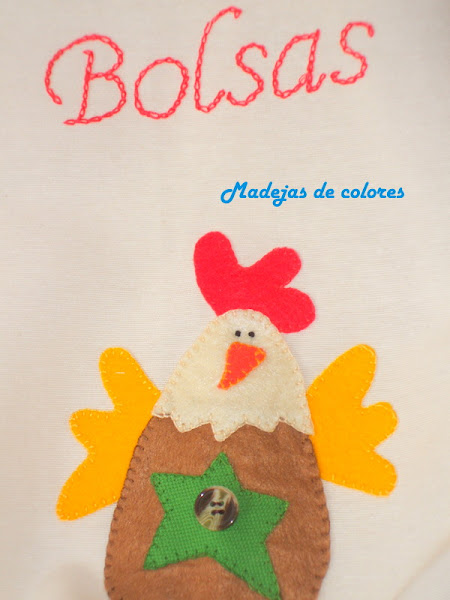 Escogí como motivo esta gallina estilo country, con fieltros en colores bien alegres. En la parte superior le bordé en rojo Bolsas, en punto cadeneta. Y en rojo también, una cinta vichy con la que cerrar y colgar la bolsa. Como adorno un botón sobre la estrella.
