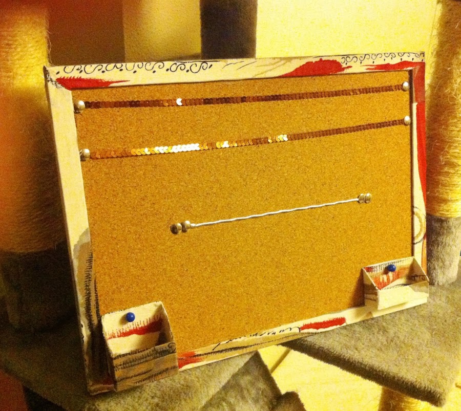 El regalo de mi madre ya lo tenía pensado. Siempre me decía que quería algo para poder poner los pendientes a la vista y ordenados. Lo que hice fue coger un corcho y decorarlo con la tela de una camisa que mi madre que ya no usaba. Luego puse varios cordeles sujetos con chinchetas e hice dos cajitas para poner las tuercas de los pendientes y así no perderlas.