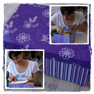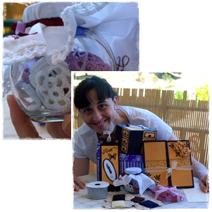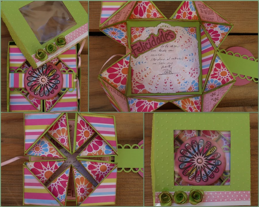 Una caja hecha por ella y en cada cajoncito un jabón tambien elaborado por ella y que huelen de maravilla!!! Con una preciosa tarjeta y un punto de libro a juego...
